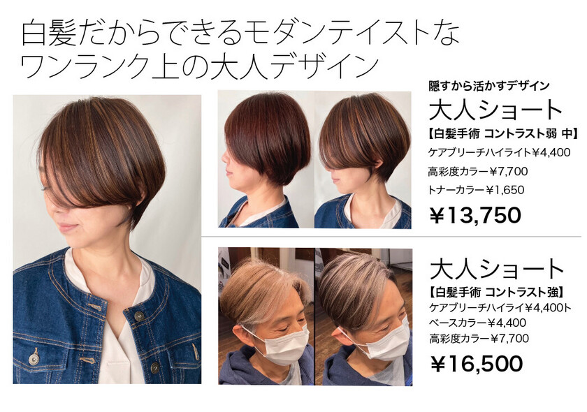 大人の白髪をおしゃれに仕上げる「白髪ぼかし」や「白髪手術」。明確にテクニックが異なるということはありませんがいずれも白髪をハイライトとして生かしつつダメージが軽減でき、次回のサロン来店期間が長く生え際が気にならず、おしゃれに過ごすことができるというメリットがあります。またデメリットとしてはやや施術時間がかかるということと、ハイライト部分が褪色した際の明るさが気になるというお声をいただきます。むろんいろいろなご提案で解決をいたしますが、いずれにしても、新しいデザインやヘアスタイルを試すことは好奇心をそそられ楽しいものです。ぜひ、春からのヘアデザインをスタイリストにご相談ください。