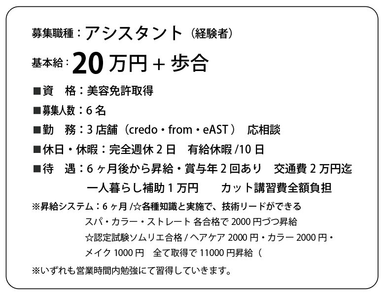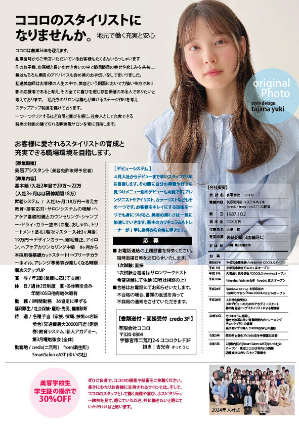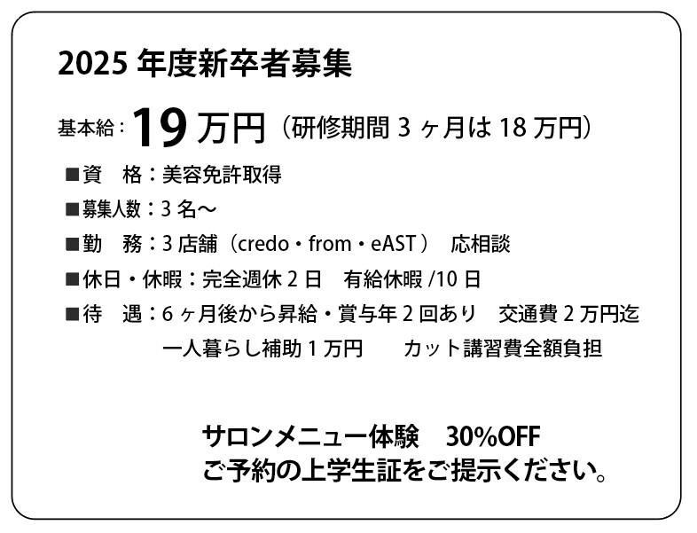 新卒予定の皆様はぜひ各店舗をご利用いただきサロンの雰囲気やイメージを感じていただきたいと思います。