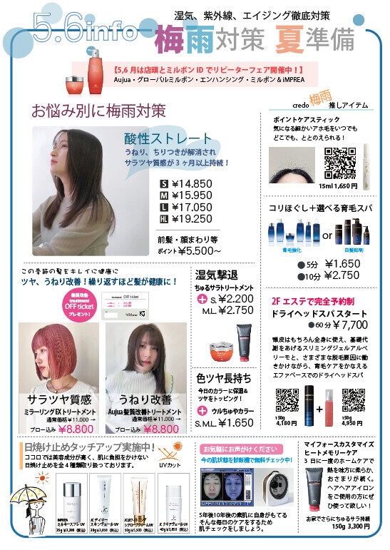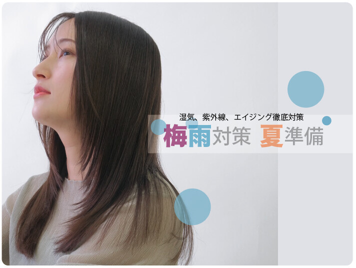 梅雨対策と夏準備の季節。湿気対策をはじめとした髪のお悩みや、素肌のトラブルなどをうまく回避して爽やかに過ごしていただくメニューをご案内。