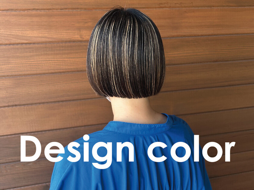 表面を美しく見せるボブスタイルは頭頂部の生え際から薄く髪をすくい取り、明るめにデザインカラーを入れ込むことで