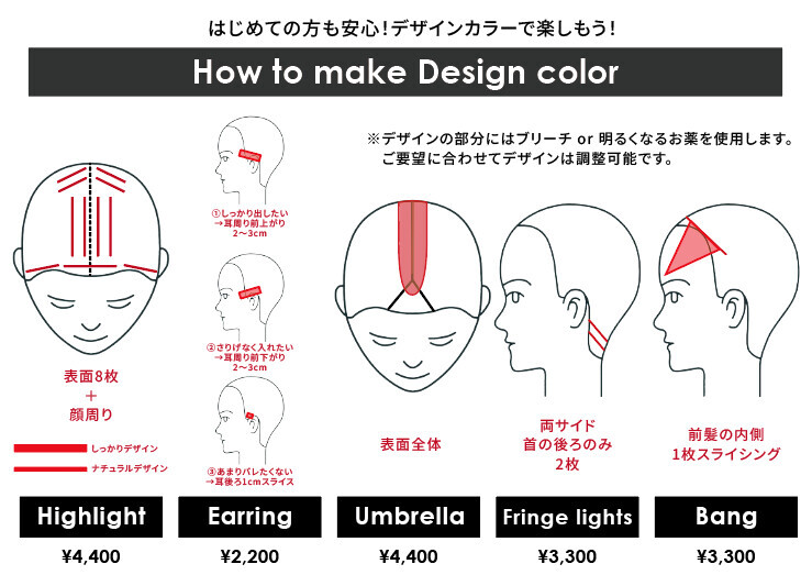 オプションで選ぶデザインカラーはパーツ別、プライス別でわかりやすい料金体系でご案内しております。さらにボリュームアップしたデザインをご希望ならぜひスタイリストとご相談ください。
