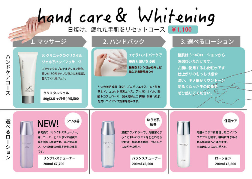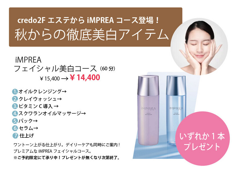 ヘア以外のメニューで人気のエステでは、9月よりインプレアのお化粧品を組み込んだフェイシャルメニューが登場!