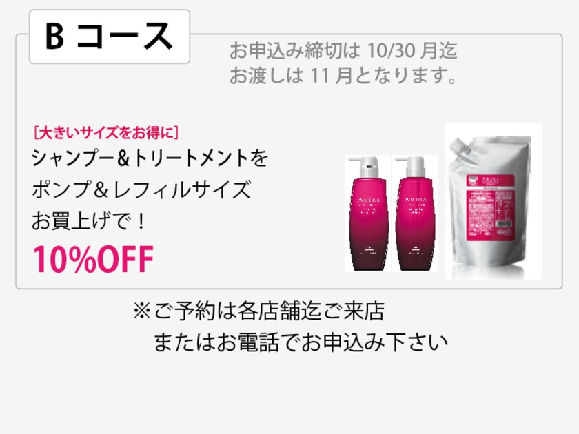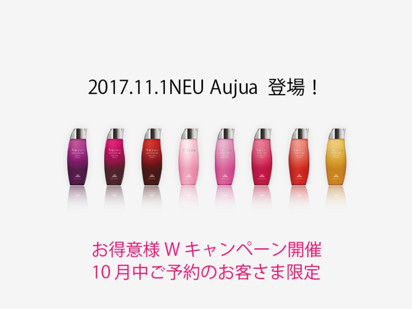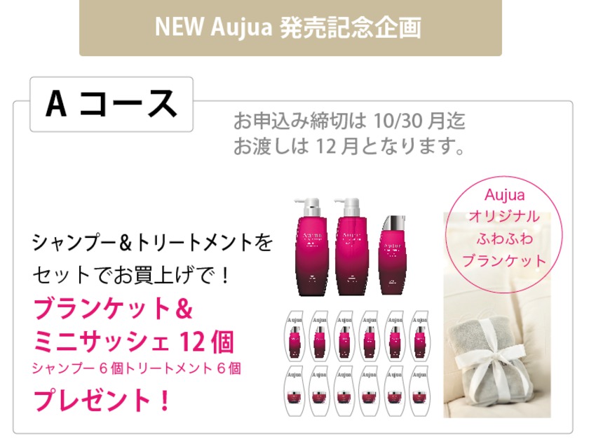 オーダーメイドのヘアケアプログラム「Aujuaシリーズ」が バージョンアップします。 これまではお悩みに合わせ補修するという明確な結果を 打ち出していたAujuaですが、 毛髪内部の徹底した研究の結果 再生を現実のものとしたのです。 今回は皆さまにいち早くこの変化を感じていただきたいという思いと Aujuaオリジナルのブランケットをセットにしたプランと 大きいサイズをお得にご購入いただける割引プランの 2つの企画をご案内させていただきます。 ソムリエによるアドバイスをお聞きになってご購入されたい お客様はぜひご予約の上ご来店下さい。 お待ちしております。 ※店頭に並びお買上げいただけるのは両店舗とも11月3日から。 キャンペーンご予約のお客様は下記の通りとなります。