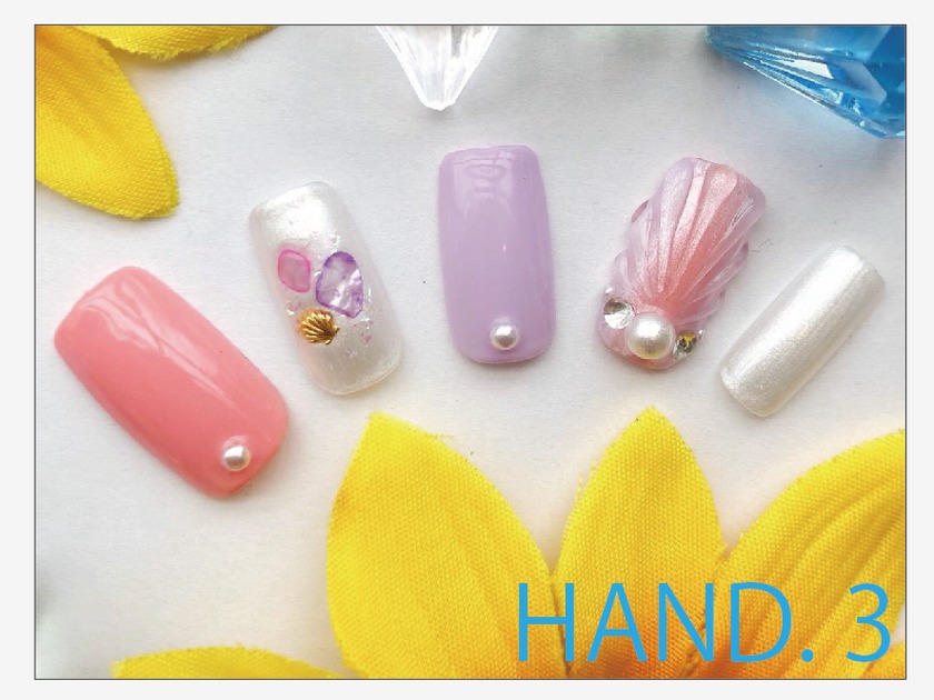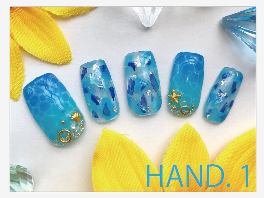 NO.1 海を感じる夏ネイル 貝やパールのパーツでキラキラ感