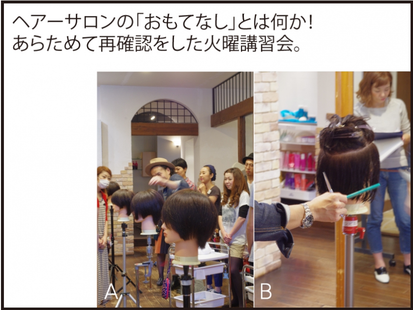 9月16日(火曜)第2回めを迎えた【原宿MINX 大竹祐紀氏】による外部講師講習会のレポートです。 午前は秋冬のトレンドを含めた色とスタイルの傾向。 午後からはデザイナー全員がウィッグを使っての大人のカットスタイルの実践テクニックでした。 軽めのレイヤーでトップや後頭部にボリュームを持たせ、ノーパーマでもフォルムを作り出せるショートスタイルテクニック。30代後半からの大人スタイルをどのようにオシャレに作りだすかというカット技術。同時にどのように似合わせをご提案するかが最大のテーマでした。 流行や個性の提案はあたりまえであり、これらはカンタンに情報として収集できる事です。 おもてなしがサービスでの当たり前とする昨今ですが、本当のおもてなしとは何か!美味しいお茶やプラスの癒やしサービスをお届けする事も大切、でも私達は「似合っているから素敵}というお客様の喜びを提供する事こそが、もっとも最高のおもてなしなのだと考えさせられる1日でした。 この秋・冬のおすすめのカラーは紅茶のような色合いに、カーキ、やパープリッシュ、ダステイー(くすませ)を意識した色合いです。トレンドも似合わせも同線にあり、お似合いのテイストが引き出せるデザイナーとして皆様をお迎えいたします。 おたのしみに!